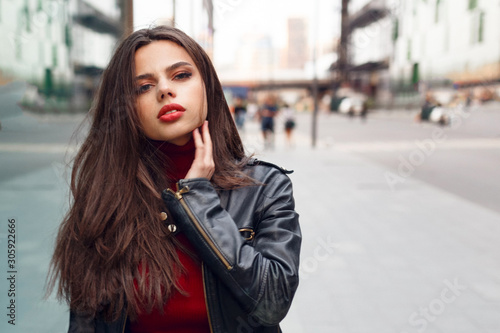 © Dragosh, Fototapeta premium Close up portait of cute brunette girl in leather jacket, walking in the city around. Lifestyle, harmony concept. Horizontal view.
