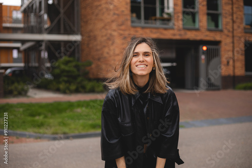 © zvkate, Fototapeta premium Close up portrait attractive young happy woman with fresh and clean skin stands outside city near building. Smiling short blonde wear leather shirt. Lifestyle, female beauty concept, look at camera