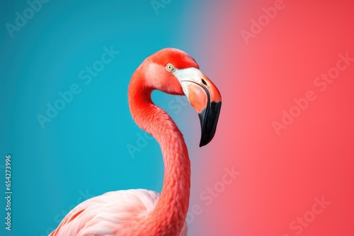 Obraz premium Close up portrait flamingo on coloured background.