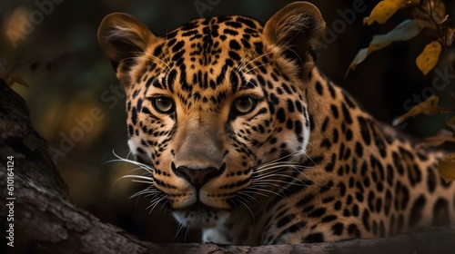 Obraz premium Close up portrait from side face ferocious carnivore leopard, stare or looking straight forward at nature background. Generative AI technology.