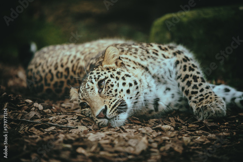 Obraz premium Close Up Portrait - Liegender Persischer Leopard (Panthera pardus tulliana) in einem Freigehege