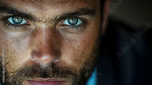 © MAKASIHMAS SIDNEY, Obraz premium Close-up portrait man intense gaze, stubble, blue eyes