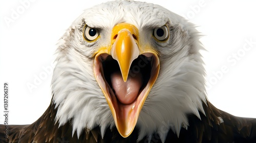 © wannakorn, Obraz premium Close-Up Portrait of a Bald Eagle Screaming with Powerful Expression Against a White Background