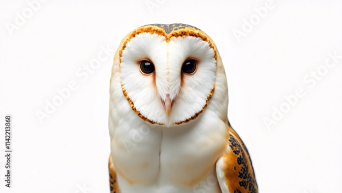 © Jane Sorell, Naklejka premium Close-Up Portrait of a Barn Owl with White and Golden Feathers on White Background