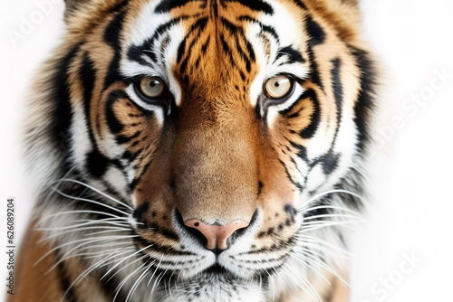 © mathiasalvez, Fototapeta premium Close-up portrait of a beautiful, serene adult tiger looking directly at the camera on a white background. Studio photograph, with a white background that can be easily cut out