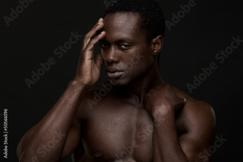 Fototapeta premium Close Up Portrait of a Black Man with Hand to Face