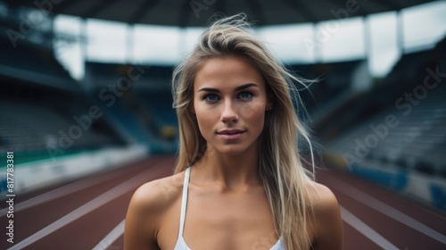 © Dennis, Fototapeta premium close-up portrait of a blonde woman with wind-swept hair, wearing a white sports top and standing on what appears to be a running track
