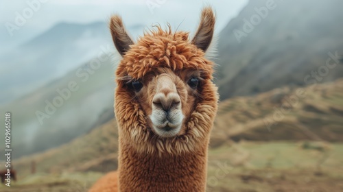 Obraz premium Close-up Portrait of a Brown Alpaca in a Mountainous Landscape