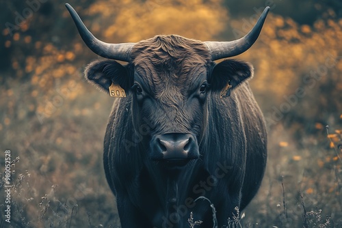 © atar, Naklejka premium Close up portrait of a brown bull with horns looking directly at the camera in a field