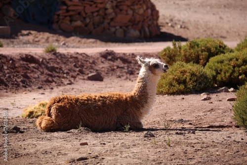 © liliportfolio, Naklejka premium Close-Up Portrait of a Brown Llama in Natural Mountain Landscape