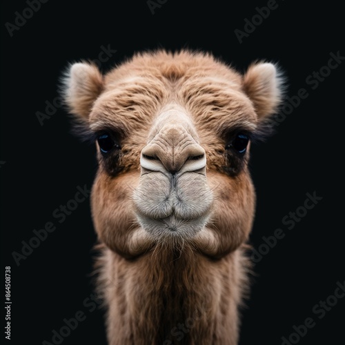 Fototapeta premium Close-up portrait of a camel against a black background, highlighting its...