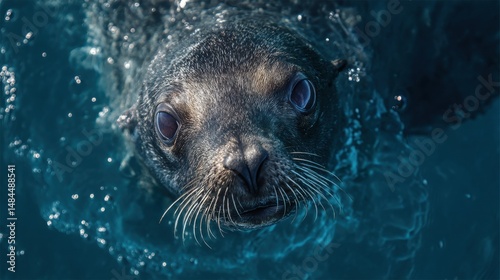 Fototapeta premium Close-up Portrait of a Curious Seal Looking Up From the Water Surface,...