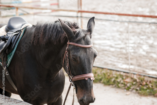 Fototapeta premium Close-up portrait of a dark brown horse wearing a bridle and saddle, standing...