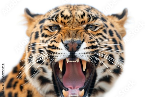Fototapeta premium Close-up portrait of a fierce leopard with detailed fur patterns, intense expression, and a white background