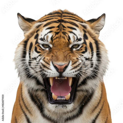 Fototapeta premium Close-up portrait of a fierce tiger roaring with mouth open and teeth exposed...