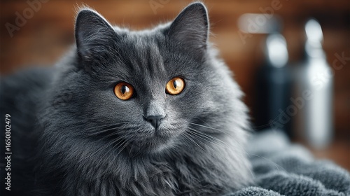 Fototapeta premium Close-up Portrait of a Fluffy Gray Cat with Intense Amber Eyes