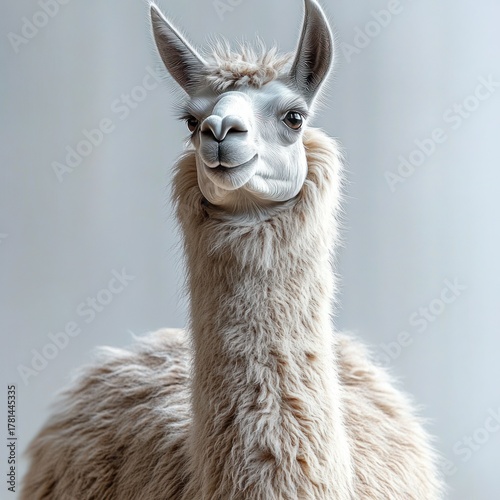 © Jdgkxbnc, Naklejka premium close-up portrait of a fluffy light brown llama looking slightly to the side with a calm expression on a neutral background