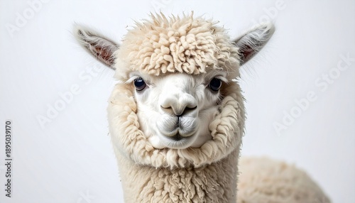 © Formasi, Fototapeta premium Close-up portrait of a fluffy white alpaca against a white background.