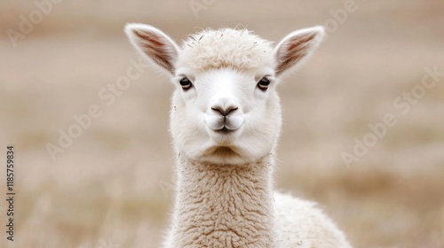© musa, Fototapeta premium Close-up portrait of a fluffy white alpaca staring directly at the camera.