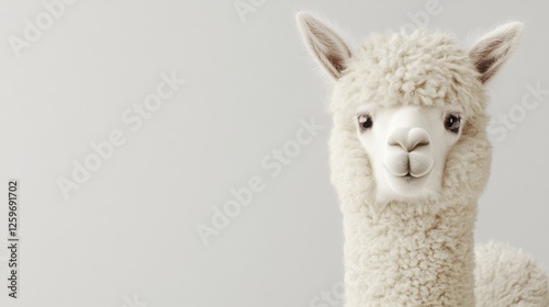 © amorn_m, Obraz premium Close-Up Portrait of a Fluffy White Alpaca with a Soft Expression in a Minimalist Studio Setting