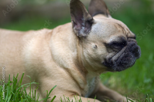 © SynchR, Fototapeta premium Close up portrait of a French Bulldog, lie in grass
