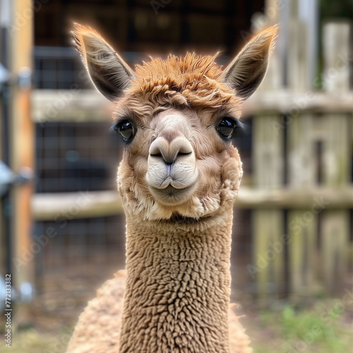 Obraz premium Close-up portrait of a friendly alpaca in a farm setting.