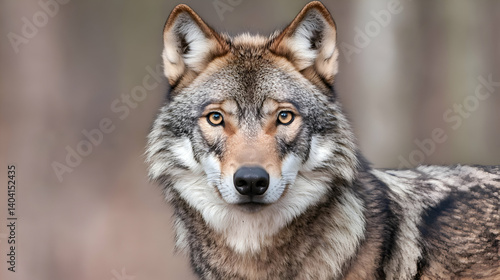 Fototapeta premium Close Up Portrait of a Gray and Brown Wolf in a Forest Setting