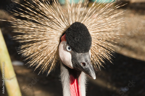 Fototapeta premium Close-up portrait of a grey crowned crane with golden crest