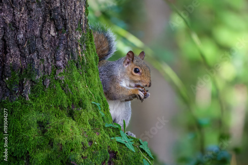 © Penny, Obraz premium close up portrait of a grey squirrel on a tree trunk eating a nut