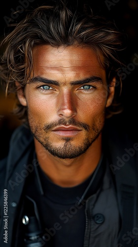 Fototapeta premium Close-up portrait of a handsome man with wavy hair and intense blue eyes.