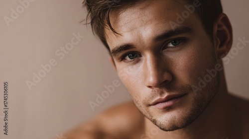 Fototapeta premium Close up portrait of a handsome young man with soft lighting and a neutral...