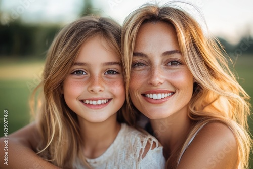 Obraz premium Close-up portrait of a happy mother and daughter smiling together outdoors with natural light and blurred greenery background