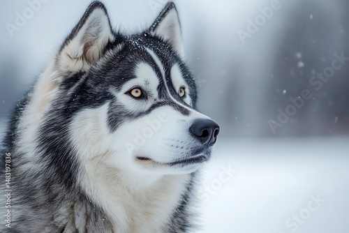 Naklejka premium Close up portrait of a husky dog with snow on its fur looking to the right in...