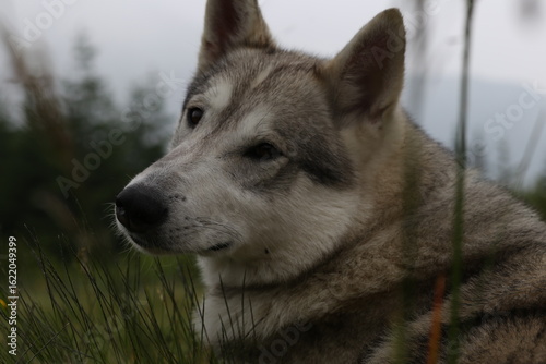 © Юрий Несмашный, Fototapeta premium Close-Up Portrait of a Husky-Wolf Hybrid