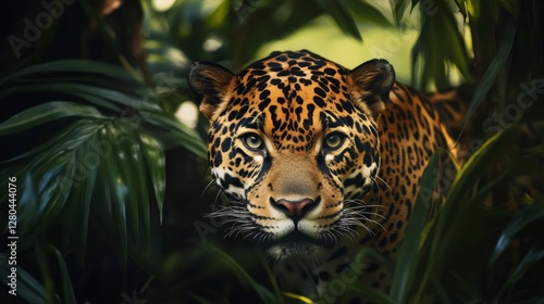 Obraz premium Close Up Portrait of a Jaguar in Lush Tropical Foliage
