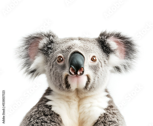 © Pixelbin, Fototapeta premium Close-up portrait of a Koala bear looking directly at the viewer with a curious and slightly surprised expression, isolated on a white background.