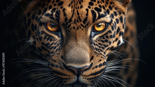 © Lexyat, Naklejka premium Close-up portrait of a leopard with intense golden eyes looking directly at the camera.