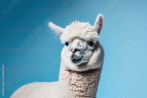 Obraz premium close up portrait of a llama against a vibrant blue background. Generative AI
