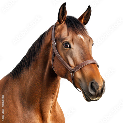 © Natthakan, Obraz premium Close-up portrait of a majestic brown horse with a bridle. transparent background
