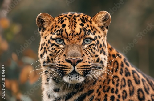 © ANUAR, Obraz premium Close-Up Portrait of a Majestic Leopard with Striking Spots and Intense Blue Eyes Surrounded by Natural Background in Soft Focus