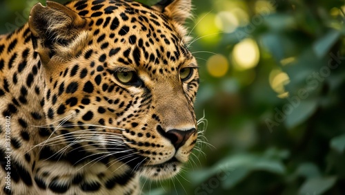 © Black M ♛, Obraz premium Close-up portrait of a majestic leopard with striking spotted fur and intense eyes, set against a blurred natural background of green foliage and bokeh lights, showcasing its wild beauty and powerful.