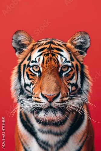 © Arnon Parnnao, Fototapeta premium Close-up portrait of a majestic tiger against a solid orange background, showcasing its striking stripes and intense gaze.