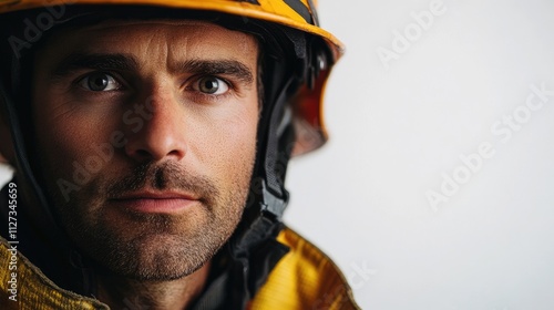 Fototapeta premium Close-up portrait of a male firefighter wearing a helmet and protective gear against a plain white background showcasing determination and bravery