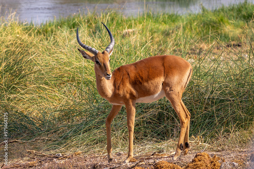 Naklejka premium Close up portrait of a male impala antelope, wildlife safari and game drive...