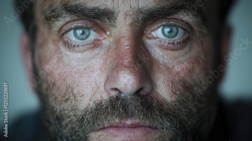 Fototapeta premium Close-up portrait of a man, intense gaze, weathered face, dark background,...
