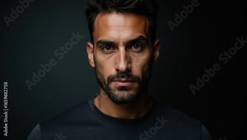Fototapeta premium Close-up portrait of a man with a serious expression against a dark backdrop,...