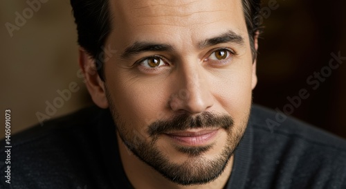 © Bang, Obraz premium Close-up portrait of a man with a thoughtful expression in a warm setting
