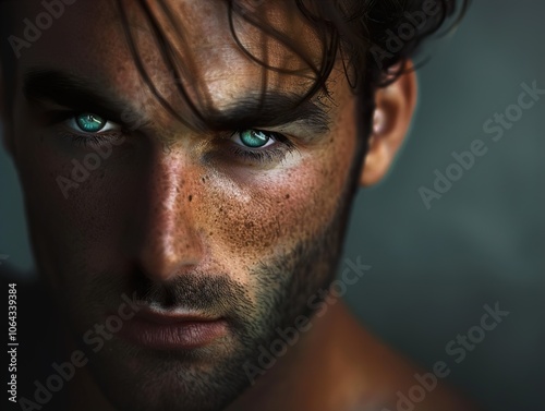 Fototapeta premium Close-Up Portrait of a Man with Intense Blue Eyes and a Shadowed Face