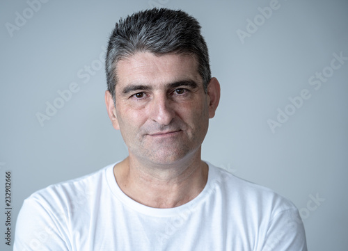 Fototapeta premium Close up portrait of a middle age man in neutral poker facial expressions and...