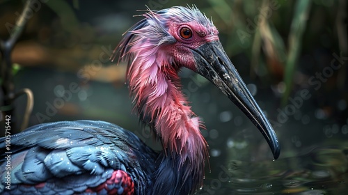 Naklejka premium Close Up Portrait of a Pink and Black Bird in Water